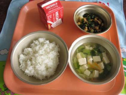 ごはん・牛乳・肉みそいため・とうふと青菜のスープ