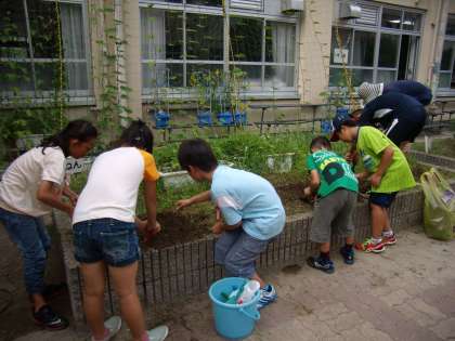昼から,4年生全員と4組で,ピーマン畑の草抜きをしました。62人全員で抜いたので,すっかりきれいになりました。次は,肥料などを混ぜて土作りをします。