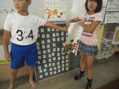 7枚ずつ並べました。Nさんはいつも通り一番右端の数字が7の段になっていると気がつきました。そして、6月のカレンダーと同じ並び方になっていることも発見しました。