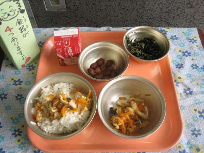 麦ごはん・牛乳・こぎつねちらし(具)・小松菜とひじきのいためもの・金時豆の甘煮