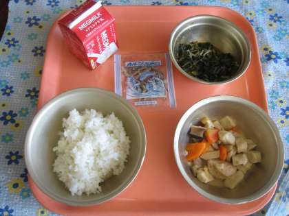 ごはん・牛乳・高野豆腐と野菜のたき合わせ・ほうれん草ともやしのごま煮・じゃこ
