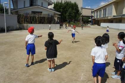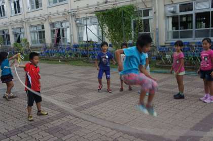 子どもたちは,なわとびやリレーなど体を動かして楽しんでいます。