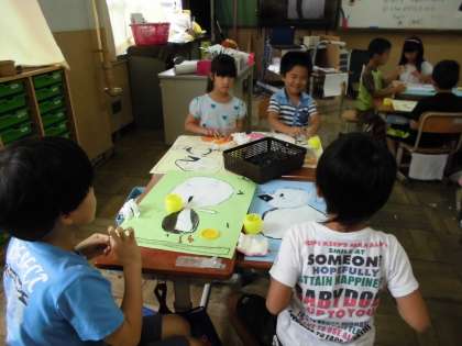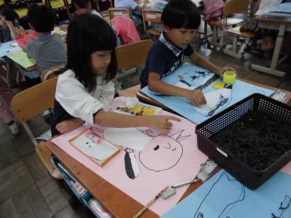 今日の図工はお話の絵の続きをしました。