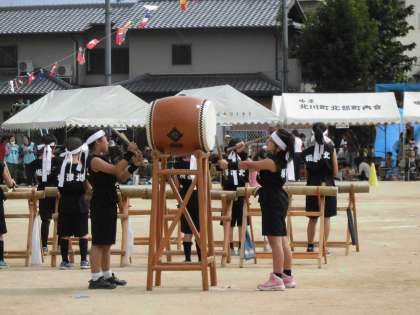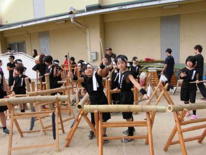 竹太鼓クラブの演目は広い運動場にも響き渡る