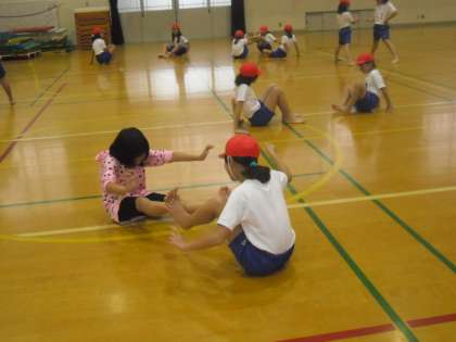 バッタ相撲の後は、ジャンケン開脚と足相撲です。ジャンケン開脚は負けた方が少しずつ足を開けていきます。足相撲は腹筋を使わねばならず、苦戦していました。