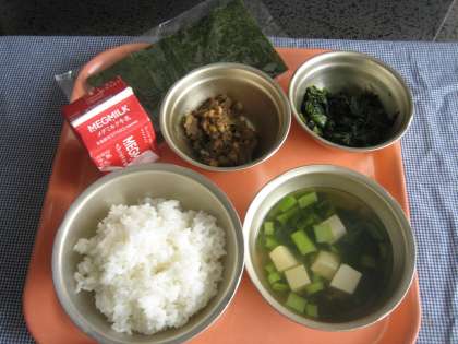 ごはん・牛乳・肉みそ納豆・ほうれん草のおかか煮・すまし汁・手巻きのり