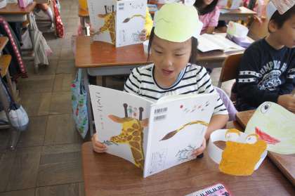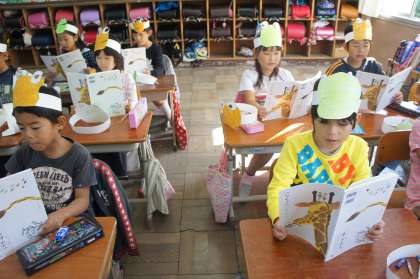 お面をつけて音読を楽しんでいます。