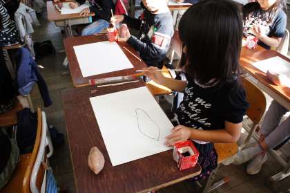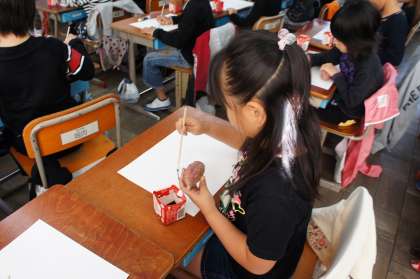 わりばしに墨をつけて輪郭をかき,