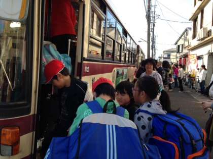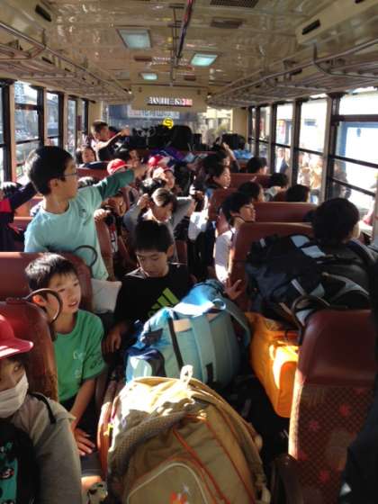 バスに乗り込みました。見送りのおうちの方に手を振って,予定より少し遅れて出発しました。