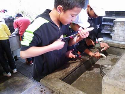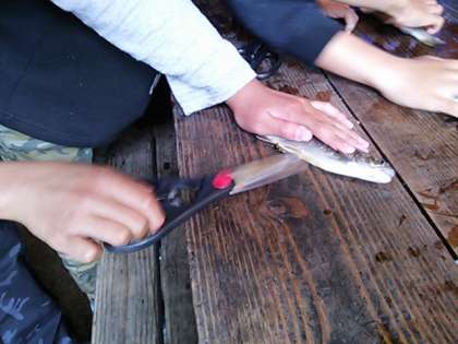 つかんだ魚をさばきます。まずは説明をしっかり聞いて,さばきます。