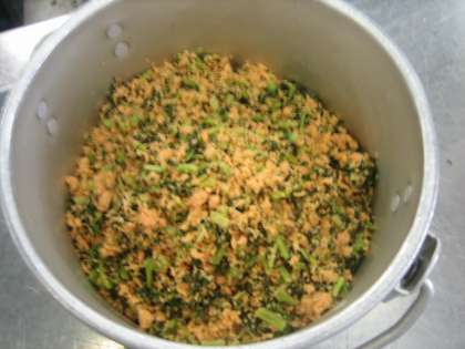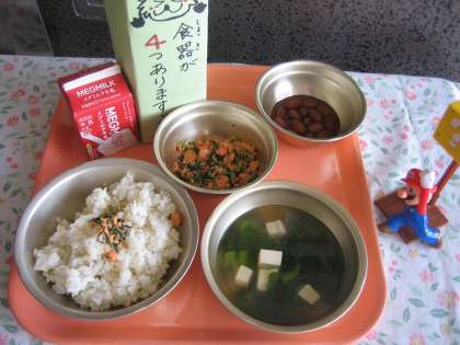 麦ごはん・牛乳・さけと大根葉のまぜごはん(具)・金時豆の甘煮・豆腐の吉野汁