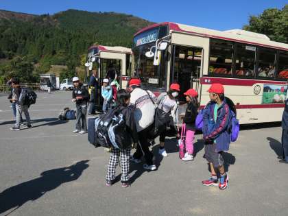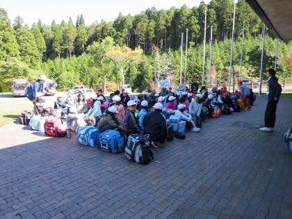 バスが山の家に到着しました。早く着いたため,前の学校が入所式をやっているので,プレイホールの横で少し待機しました。