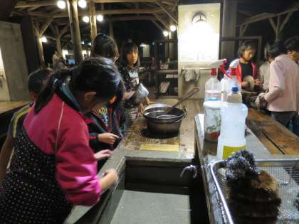 食べた後は,片付けです。鍋についたすすは,金たわしでこするのですが,なかなかきれいになりません。それでも子どもたちは,水が冷たいのにも負けずにがんばりました。
