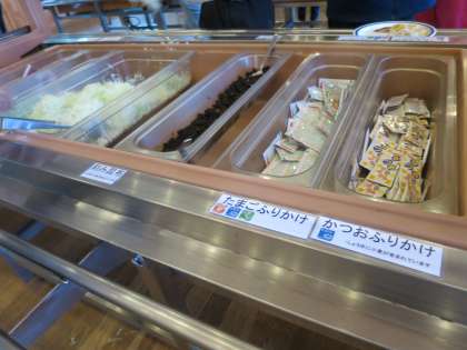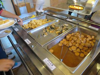2日目の朝食です。ごはんかパン,味噌汁かコンソメスープを選びます。おかずはバイキングで,ミートオムレツ,ポテトフライ,さばの塩焼き,がんも煮,千切りキャベツ,です。そのほかに,いちごジャム,マーガリン,ふりかけ,漬物,乳酸菌飲料もありました。