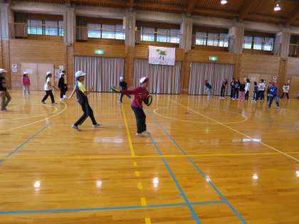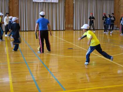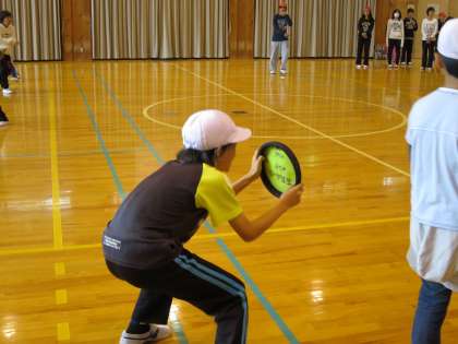 これは,ドッチボールのように見えますが,投げているものが違います。やわらかくて,当たっても全然痛くありません。投げ方は,フリスビーと同じです。