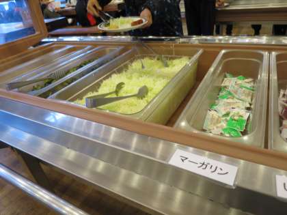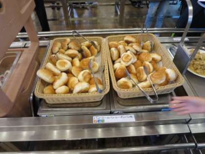 朝食のメニューは,ごはんかパン,コンソメスープかみそ汁,ミートボール,ポテトフライ,プレーンオムレツ,春雨巾着の煮物,千切りキャベツ,いちごジャム,マーガリン,ふりかけ,漬物,乳酸菌飲料です。