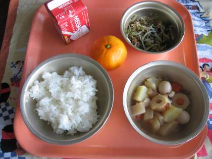 ごはん・牛乳・関東煮・もやしと小松菜のごま炒め・みかん