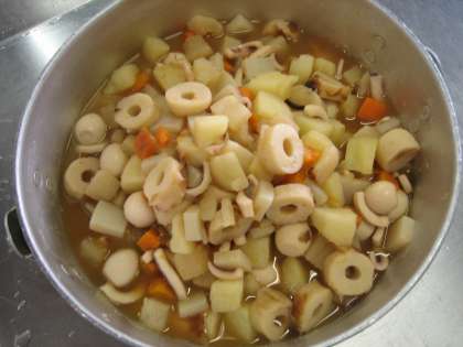 「関東煮」は昆布とけずりぶしでとっただし汁の中にこんにゃく・人参・大根・じゃがいも・ちくわ・うずら卵・いかをコトコトじっくり煮込みました。