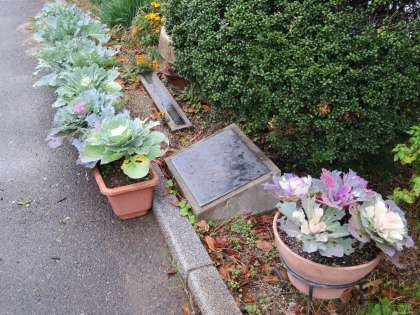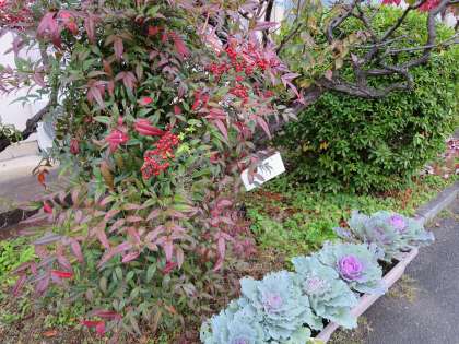 玄関の桜は,ほとんど葉が落ちました。また,ナンテンの実が真っ赤です。葉牡丹も植えてあります。