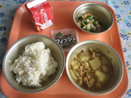 麦ごはん・牛乳・肉じゃが(カレー味)・切干大根の煮つけ・じゃこ