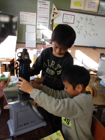 はかりで重さを調べました