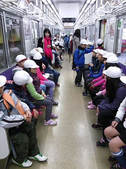 乗ってきた方に席を譲っていました。行も帰りも公共のマナーを学ぶ学習です。