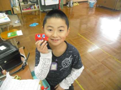 NさんがIさんのためにアイロンビーズで作っていた車の作品です。4組のクリスマスツリーに飾ってから渡すつもりでしたが、早速プレゼントしていました。Iさんに早く喜んでほしいから、だそうです。