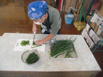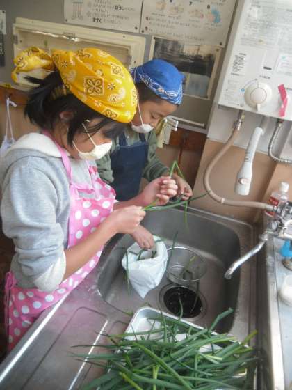 畑のネギが順調に育ち、今日はネギ焼きを作って食べました。ほとんど二人で作りました。ネギを洗って切っているところです。