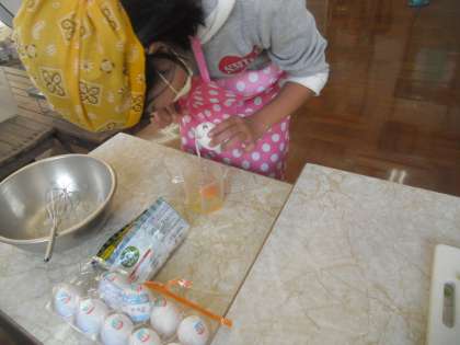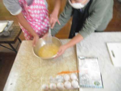 卵を割って混ぜているところです。指導者が何も指示しなくてもそっとボールに手を添えて安定できるようにしてあげてるのがIさんです。