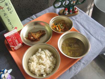 麦ごはん・牛乳・さばのみそ煮・野菜のきんぴら・ずいきのくずひき
