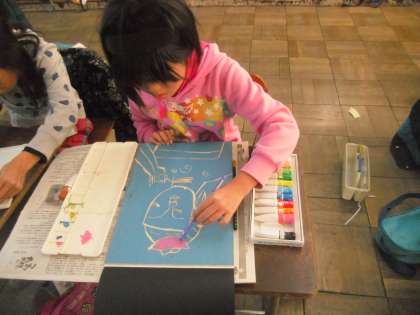 弥勒菩薩像です。彫った版に色をつけているところです。