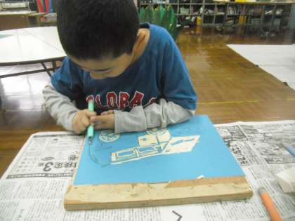 大好きな車の版画を制作しています。NY先生の車を見て描きました。線彫り、面彫りを使い分けて彫っています。今日、根気よく彫り進めて完成しました。