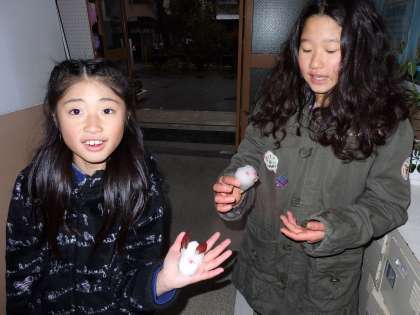 南天の実を使って雪うさぎ作りをしていました。