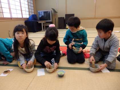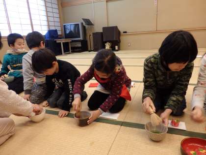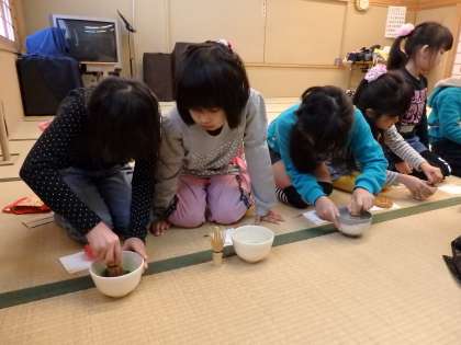 前回も練習したお抹茶をたてる作法は,たくさんの子が覚えていました。「『の』の字を書くみたいにするねんで!」と初参加の子に教えたりしながら,みんなでワイワイと楽しみました。手首を使ってたてるのは難しいですが,みんな上手にお抹茶をたてられていました。
