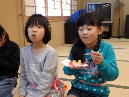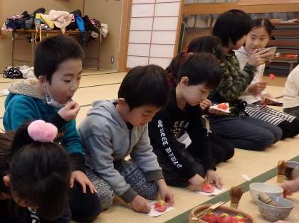 練習を頑張った後は,お抹茶とお茶菓子で一服です。甘いお茶菓子と苦いお抹茶がとても合います。お茶菓子は毎回和菓子屋さんにお願いし,季節の上生菓子を作っていただいています。今回は鮮やかな椿の形のお菓子で,みんなで美味しくいただきました。