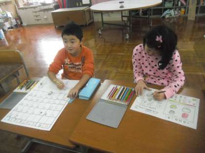 給食調理員さんから給食室に掲示する給食カレンダーの色塗りのお仕事をもらっています。2人で給食カレンダーと、4組教室に掲示する1月カレンダーを仕上げています。Nさんが丁寧に塗るので、Iさんも触発されて根気強く丁寧に塗るようになりました。
