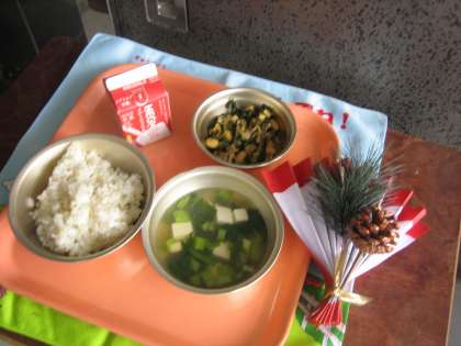 麦ごはん・牛乳・肉みそいため・とうふと青菜のスープ