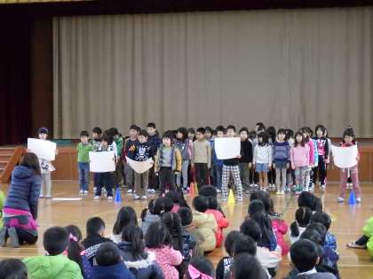 今日は朝に梅北タイムがありました。今回は2年生たちが,かけ算のなぞなぞやかけ算体操などを発表してくれました。