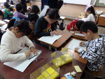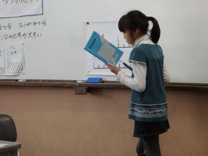 3年生の事前授業は小数と分数の大きさを比べる授業です。実物を使ってみたり,図を書いてみたりして大きさを比べました。発表も自分でかいた図を使って,3年生らしくしっかりと自分の意見を発表できていました。