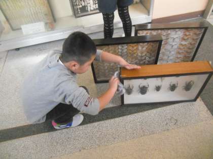 職員室前の廊下に蝶やカブトの標本などがガラスケースに陳列してあります。4月、校長室前のカブトの標本のガラスケースを4組で拭き掃除をしてきれいになったことを思い出して、「ここの拭き掃除もやりたい!」とIさんが提案してくれました。今日は埃だらけのケースを開けて標本入れを拭きました。まだまだ、時間がかかりそうです。いつも4組の掃除を手伝いにきてくれている6年2組のお姉さんお兄さんに、明日ここの拭き掃除を手伝ってもらうことになっています。