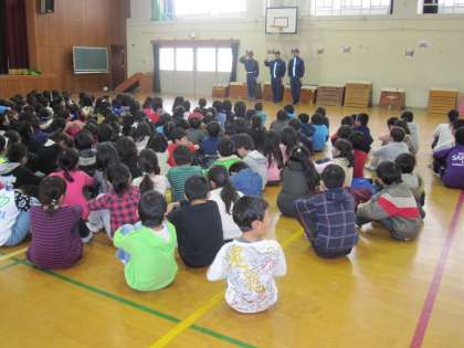 1〜3年生は、右京消防署御室出張所から職員の方に来ていただいて,防災について学びます。