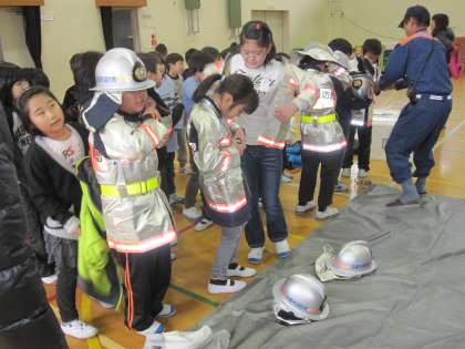 子どもサイズの防火衣、ヘルメットを着せてもらいました。