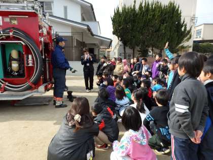 今日は3・4時間目に防災教室がありました。IさんとNさんも参加し,3年生と一緒に消防車の見学をしました。消防車の仕組みやいろいろな道具の役割を聞いたり,質問ができたりして,楽しく防災について学べました。