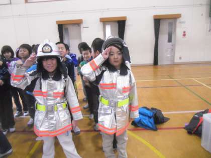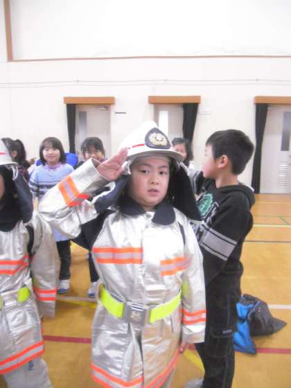 まずは消防服着用体験です。なかなか着にくいしヘルメットは重かったです。