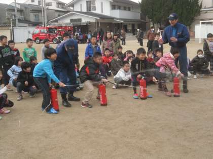 消火器体験をしました。薬品ではなく水を目標物めがけてかけました。