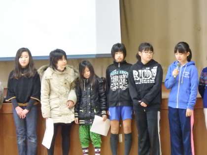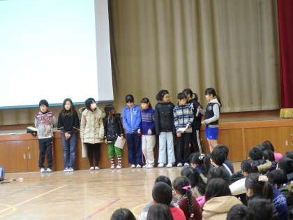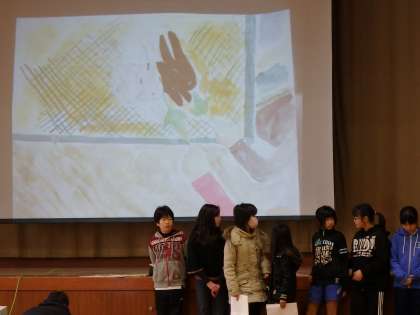 飼育委員さんの発表は,梅津北小学校で飼われているウサギの紙芝居と〇×クイズでした。紙芝居では,ウサギに食べられない葉っぱをあげないことをお話にして,みんなに注意していました。