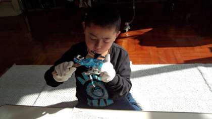 ヘリコプターにニスを塗りました。Iさんは去年もニスを塗った経験があるので、手につかないよう軍手をはめて作業しています。できあがったヘリコプターを手にして「ブーーン、パタパタ…」などと言いながら空中で動かして遊んでいました。