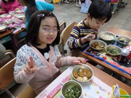 もちろん味もとても美味しいです。柔らかい平天と,ぷりぷりのこんにゃくの組み合わせが楽しめるこの献立は,子どもたちにも人気のメニューの1つです。今日のプレゼントは,とても可愛い妖怪ウォッチの「ジバニャン」でした。おめでとうございます!