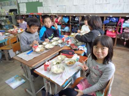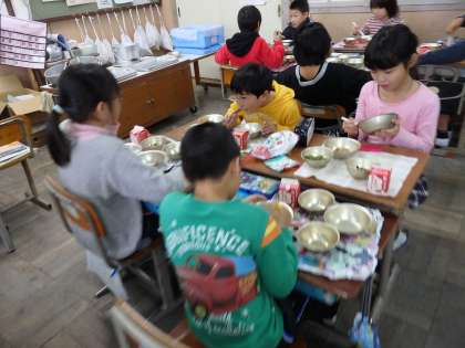 3年1組の給食のようすです。みんな味わって給食を楽しんでいました。