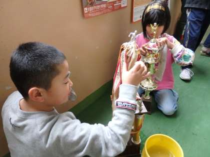 2月に行われる研究発表の日に向けて,今日は6年生と一緒に校長室前のガラスケースの中をきれいに掃除しました。トロフィーや盾はホコリを拭きとり,ケースも雑巾で磨きました。